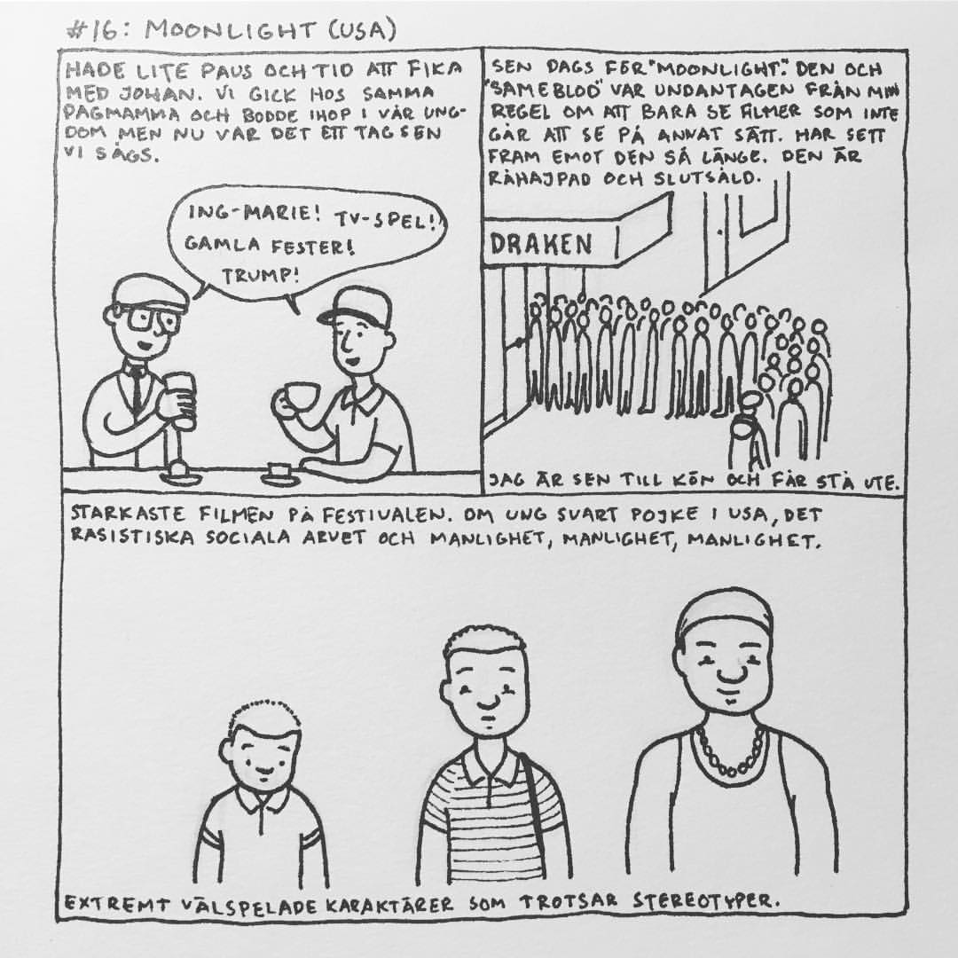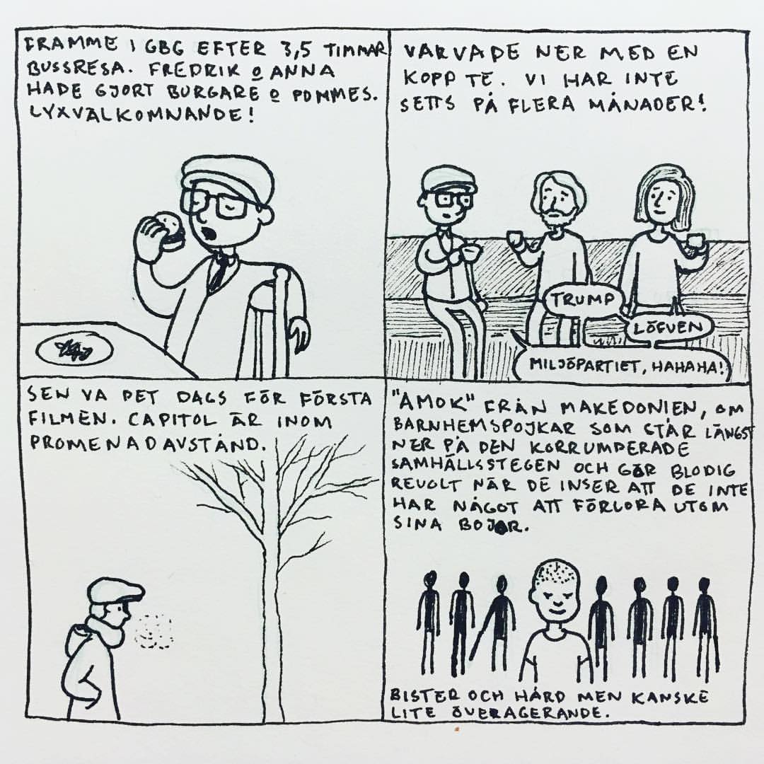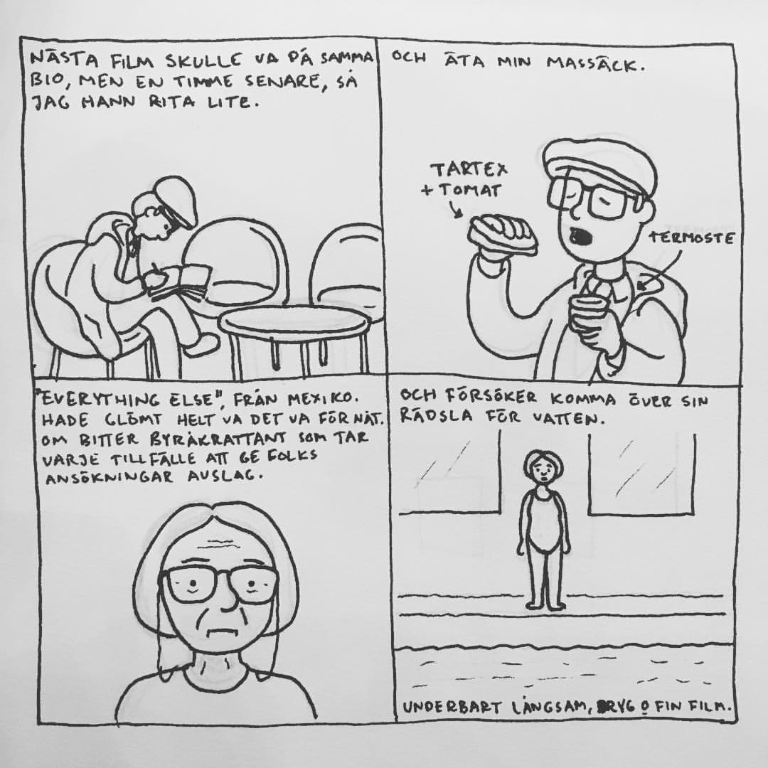 Härom veckan var jag på Göteborgs Filmfestival. Jag brukade alltid gå när jag bodde i Göteborg men har inte haft tid/råd sedan jag flyttade till Malmö. Men i år såg jag till att ha det. Jag upptäckte att ”24 hour comic day” – en dag då serieteckare över hela världen ritar en serie varje timme om vad de gjort under den gångna timmen – skulle infinna sig medan jag var där och jag var lite sugen på att delta i det samtidigt. Men jag har aldrig gjort det förr och jag känner att dagboksserier generellt är svårt, så jag bestämde mig för att öva lite inför händelsen. Så jag började rita snabba serier om filmerna jag såg och vad jag gjorde mellan visningarna. Och upptäckte att jag gillade det, och inte ville avbryta det för 24 hour comic day, så jag körde på med mitt eget race. Jag hann se 16 filmer och även göra 16 serier (men inte så mycket annat) som jag la upp på instagram medan jag gjorde dem. Och här är de nu samlade: