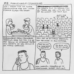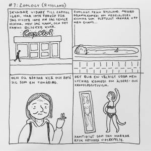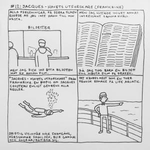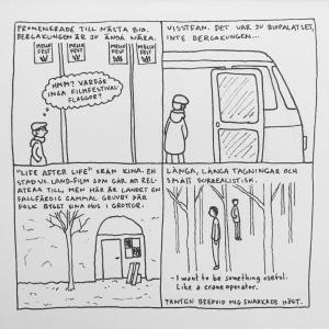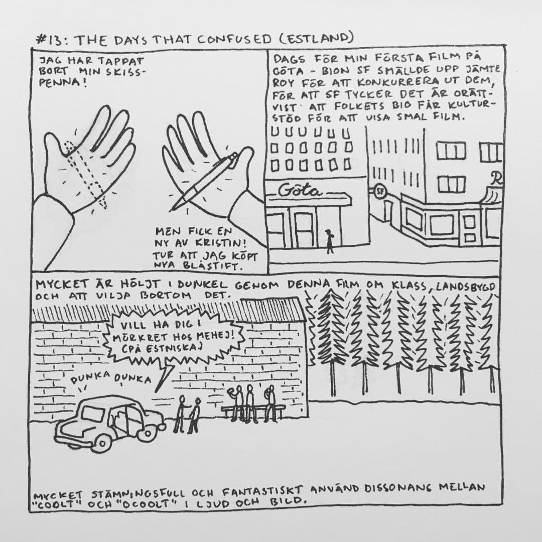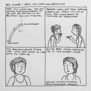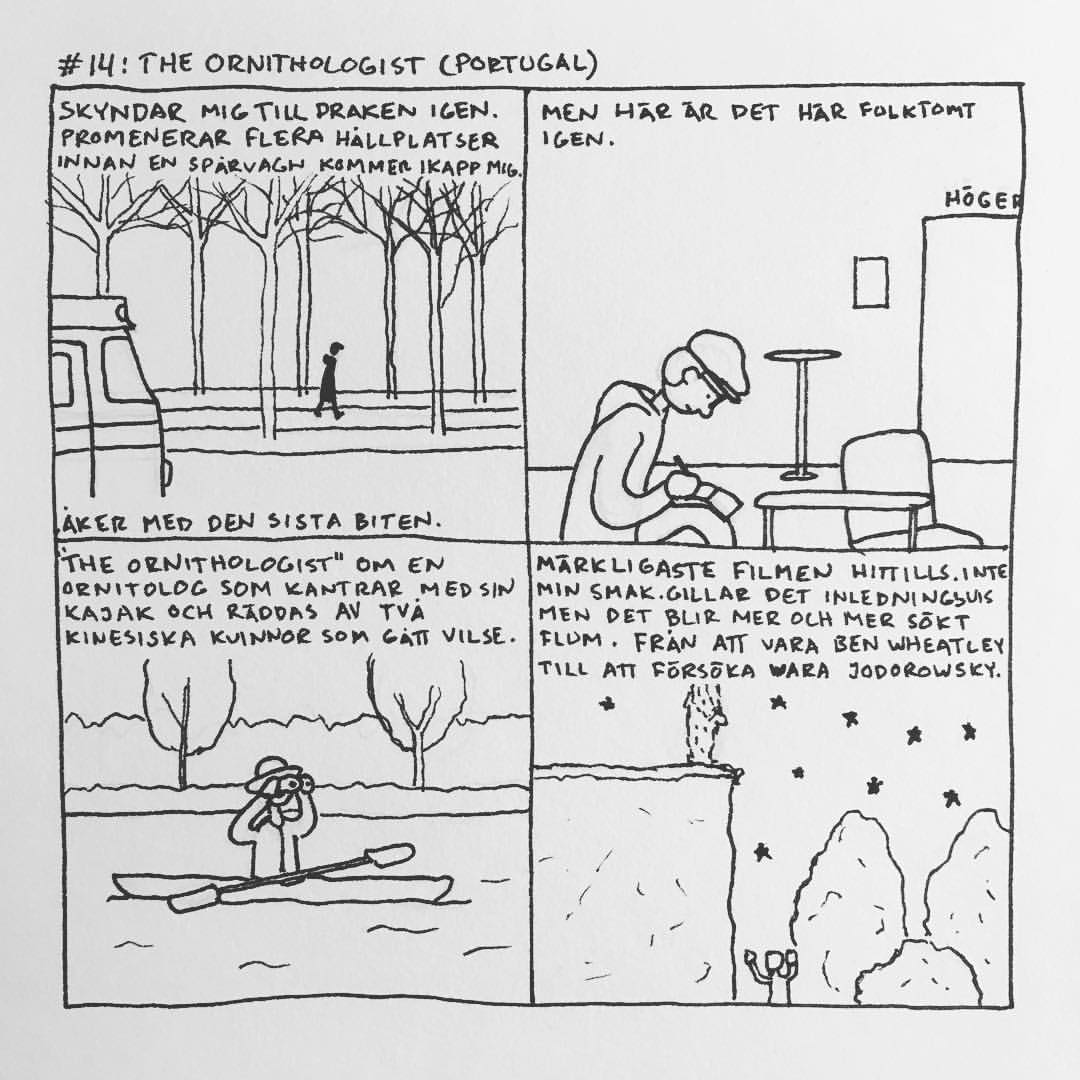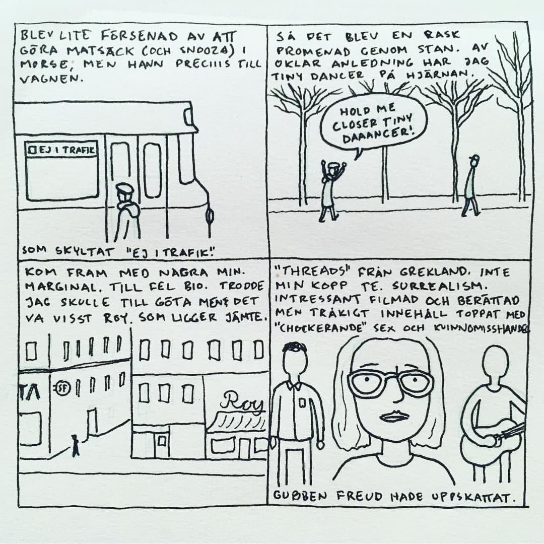 Härom veckan var jag på Göteborgs Filmfestival. Jag brukade alltid gå när jag bodde i Göteborg men har inte haft tid/råd sedan jag flyttade till Malmö. Men i år såg jag till att ha det. Jag upptäckte att ”24 hour comic day” – en dag då serieteckare över hela världen ritar en serie varje timme om vad de gjort under den gångna timmen – skulle infinna sig medan jag var där och jag var lite sugen på att delta i det samtidigt. Men jag har aldrig gjort det förr och jag känner att dagboksserier generellt är svårt, så jag bestämde mig för att öva lite inför händelsen. Så jag började rita snabba serier om filmerna jag såg och vad jag gjorde mellan visningarna. Och upptäckte att jag gillade det, och inte ville avbryta det för 24 hour comic day, så jag körde på med mitt eget race. Jag hann se 16 filmer och även göra 16 serier (men inte så mycket annat) som jag la upp på instagram medan jag gjorde dem. Och här är de nu samlade: