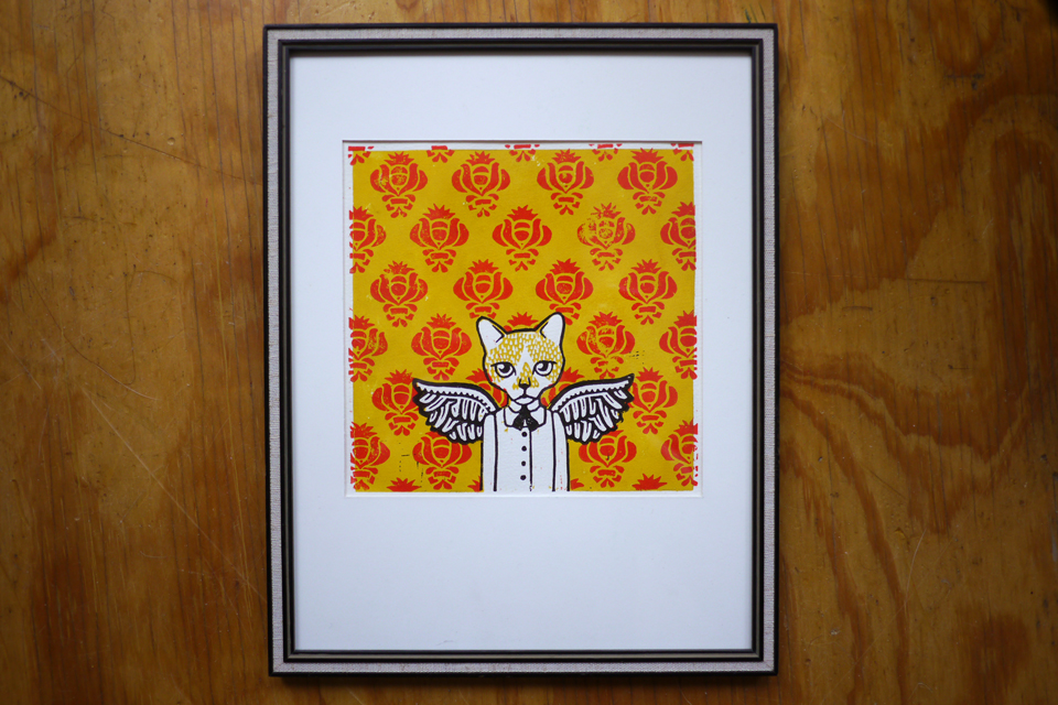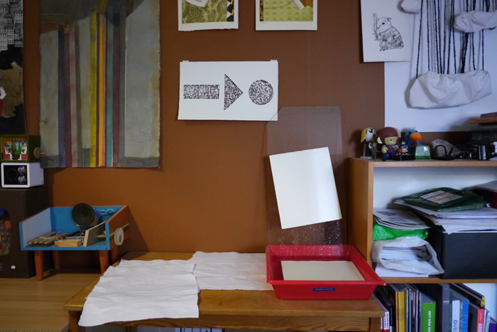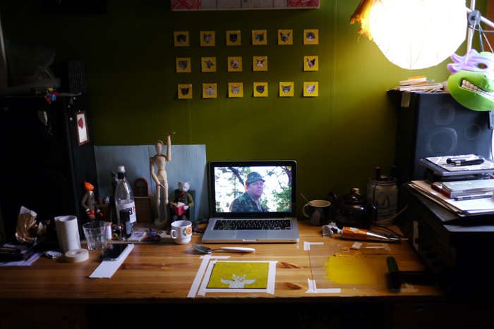 Så det blev en mycket lyckad release av Maja Stina som fanzine, till slut. Jag tog det även med till Stockholms internationella seriefestival, som var för några veckor sedan. Också där väldigt lyckat. Hem igen till Serieskolan, där vi nu precis satt upp vår slututställning och jag byggde min del av den kring framför allt Maja Stina, som jag alltså fortsatt jobba med fastän serien varit färdig sedan i januari. Bland annat så sydde jag dockan som syns i första rutan och tryckte upp en av tapeterna som syns i bakgrunden i hemmet Maja Stina arbetar i.
